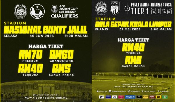 Sementara itu, bagi perlawanan Pusingan Kelayakan Akhir Piala Asia 2027 antara Malaysia dan Vietnam yang dijadual berlangsung di Stadium Nasional, Bukit Jalil, pada Selasa, 10 Jun, harga tiket ditetapkan seperti berikut: Tiket Terbuka RM40, Tiket Grandstand RM60, Tiket Premium RM70, dan Tiket Kanak-kanak (6 hingga 12 tahun) RM5.