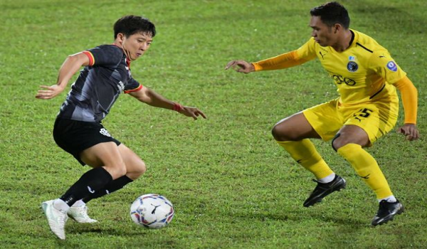 (Pemain Sarawak United FC Lee Changhoon (kiri) cuba mengelecek pemain Penang FC