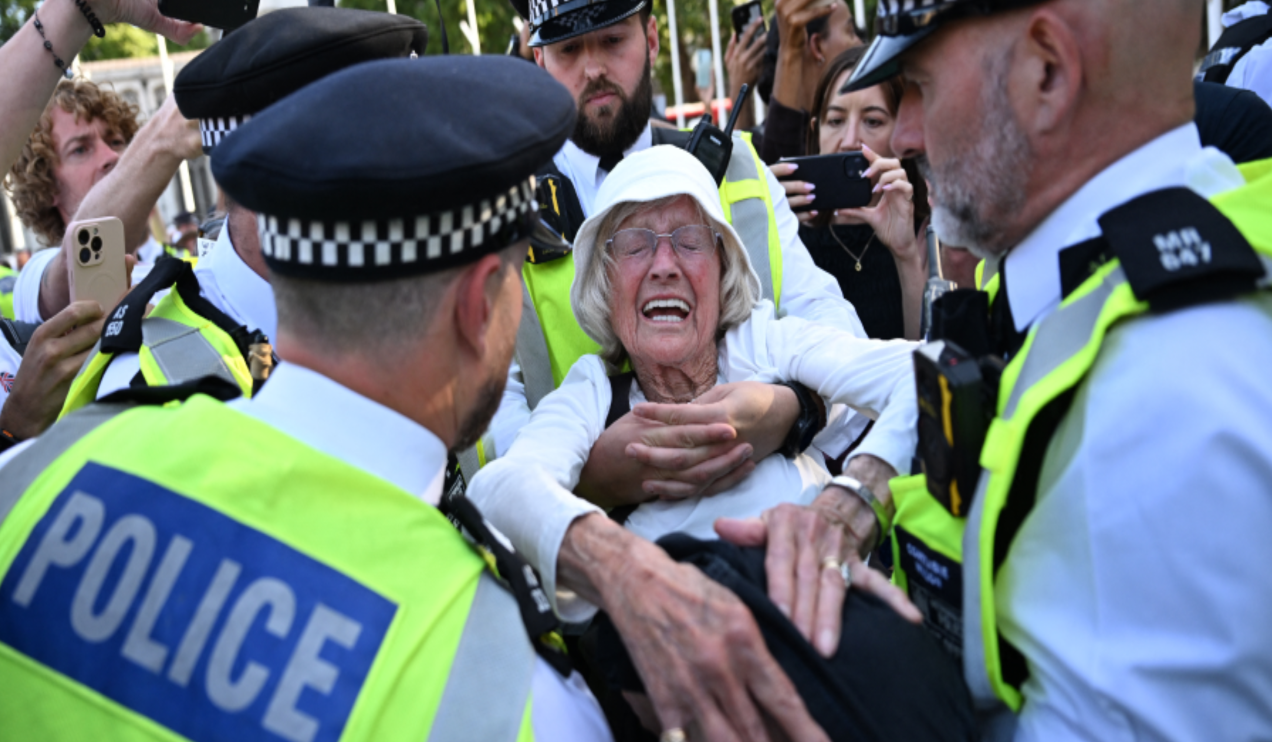 LONDON, 10 Ogos – Wanita 89 tahun antara 365 individu ditahan dalam demonstrasi menyokong kumpulan Palestine Action, di Parliament Square, di sini, pada Sabtu.