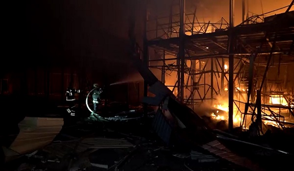 Foto serta rakaman video menunjukkan anggota bomba berusaha memadamkan kebakaran ketika api yang marak memusnahkan deretan gerai pasar serta beberapa struktur lain.