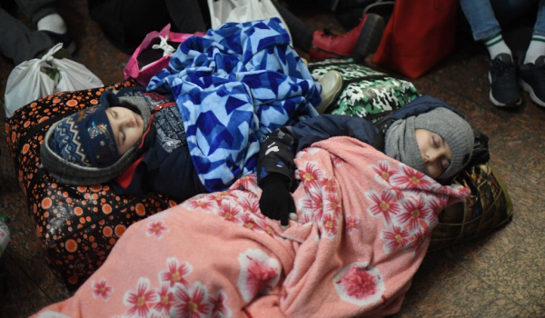 (Kanak-kanak sedang tidur di atas lantai di stesen kereta api pusat Lviv di Ukraine Barat/AFP)