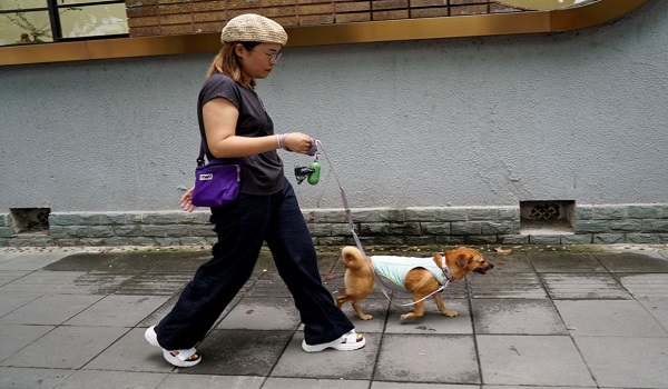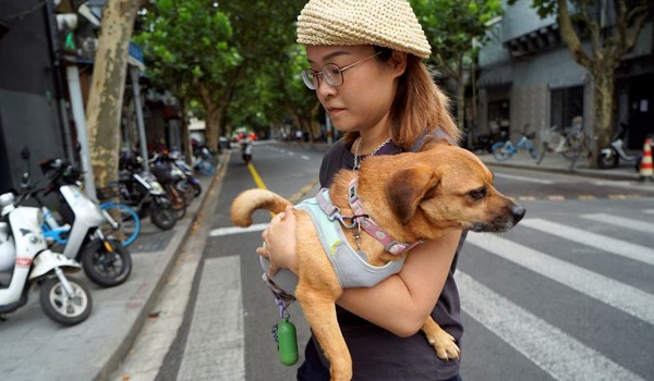 (Mi Jiayi membawa anjingnya di Shanghai/REUTERS)