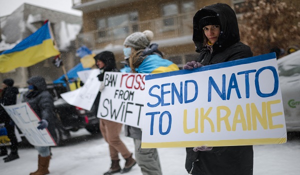 (Komuniti Ukraine di Montreal, Quebec mengadakan bantahan dihadapan kedutaan Rusia pada 25 Februari, menggesa penghantaran tentera NATO ke Ukraine/AFP)