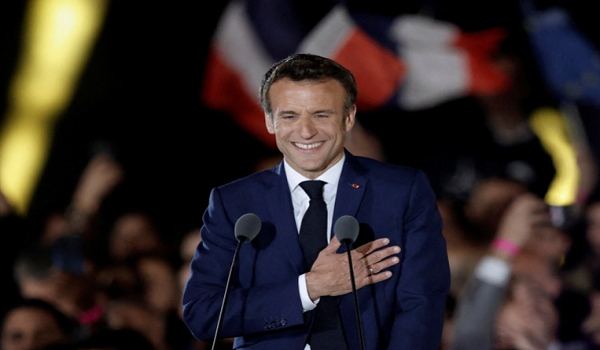 (Emmanuel Macron menyampaikan ucapan selepas dipilih semula sebagai presiden semasa perhimpunan kemenangannya di Champs de Mars di Paris, Perancis/REUTERS)