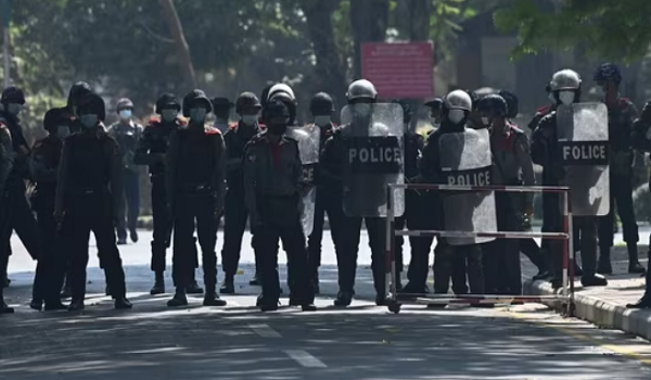 (Polis menghalang jalan di Yangon/AFP)
