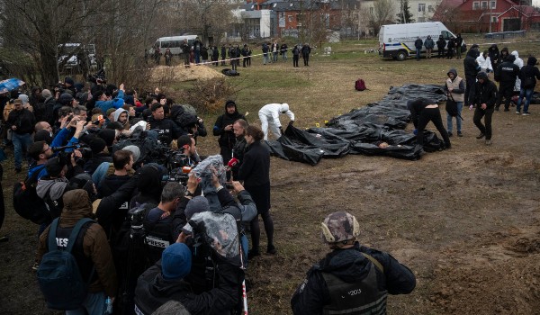 membariskan mayat orang awam yang dikumpulkan dari kubur besar di Kiev, Ukraine pada 8 April lalu/FOTO AP)