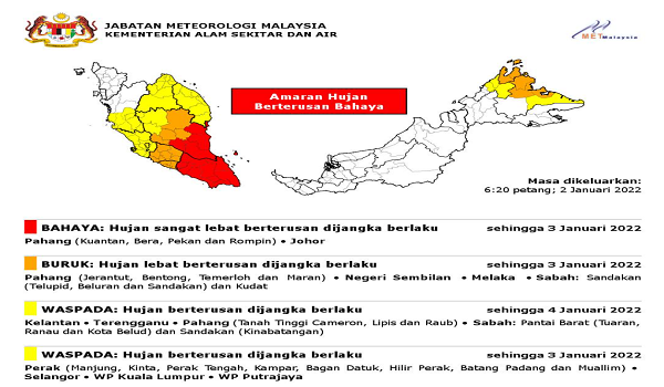 PUTRAJAYA, 3 Januari – Jabatan Meteorologi mengeluarkan amaran hujan berterusan peringkat bahaya, buruk dan waspada yang dijangka berlaku di kebanyakan negeri hingga Selasa.