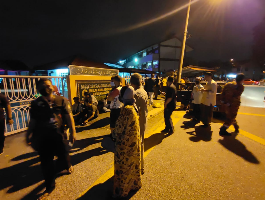 (Orang ramai luar bangunan asrama SAMT Sultan Hisamuddin di Taman Bijaya semasa kebakaran/FOTO IHSAN BOMBA)
