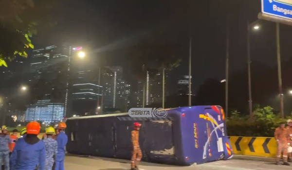 (Keadaan bas ekspres yang terbabas lalu terbalik di Lebuhraya Damansara susur ke Bangsar, tengah malam tadi)