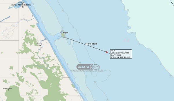 Pengarah Maritim Terengganu, Kepten Maritim Muhammad Suffi Mohd Ramli berkata lokasi kejadian bot karam terbabit adalah di kedudukan lapan batu nautika, Pulau Kapas.