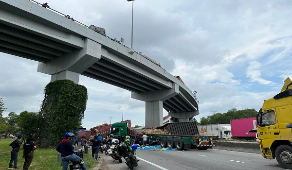 Kontena yang mengandungi barangan kitar semula itu, jatuh dari jejambat setinggi 12 meter dan telah menghempap bahagian belakang sebuah lori sebelum dilanggar lori yang dipandu mangsa dan mengakibatkan mangsa tersepit.