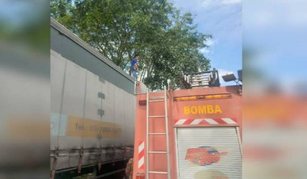 (Pasukan bomba meletakkan jentera di sebelah lori kontena bagi memudahkan polis menahan lelaki dipercayai tidak siuman/Foto JBPM Selangor)