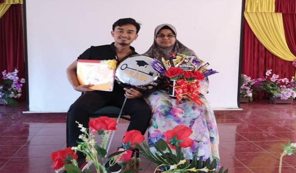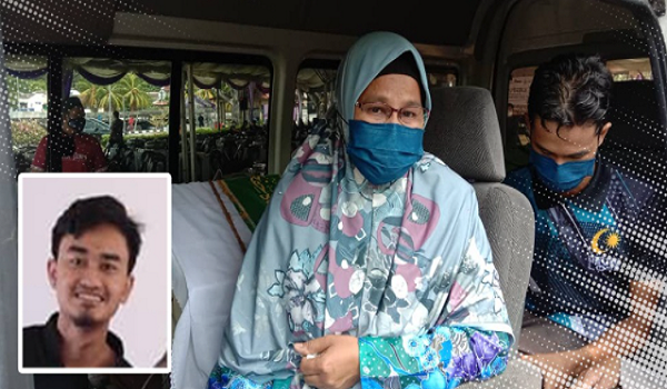 (Wan Rubiah bersama jenazah anaknya, Lukman Hakim (gambar kecil) yang maut selepas terjatuh bangunan asrama USM)