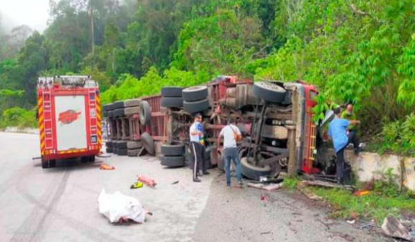 KUANTAN, 26 April- Seorang pemandu treler dan kelindannya maut selepas kenderaan muatan besi yang dinaiki mereka terbabas semasa menuruni kawasan berbukit di KM55 Jalan Lipis-Merapoh, Lipis hari ini.