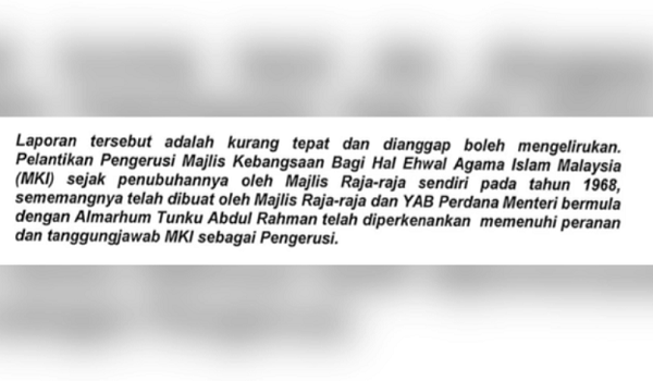 “Mesyuarat Majlis Raja-Raja hanya membuat ketetapan bahawa seorang daripada Raja Pemerintah wajar memikul tanggungjawab sebagai Pengerusi Majlis Kebangsaan Bagi Hal Ehwal Agama Islam Malaysia (MKI) selama dua tahun secara bergilir-gilir” menurut kenyataan itu