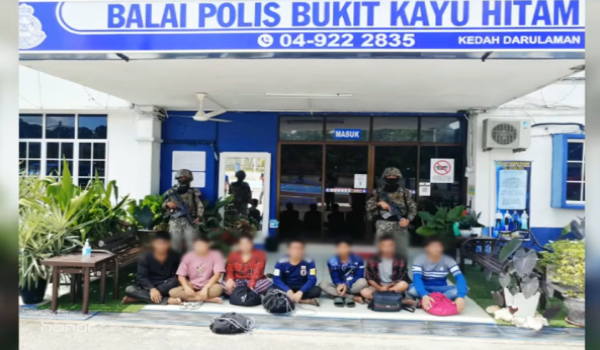 BUKIT KAYU HITAM, 21 Jun- Tujuh Pendatang Asing Tanpa Izin (PATI) ditahan ketika cuba memasuki negara secara tidak sah melalui sempadan negara Malaysia/Thailand di Bukit kayu Hitam, Kedah.