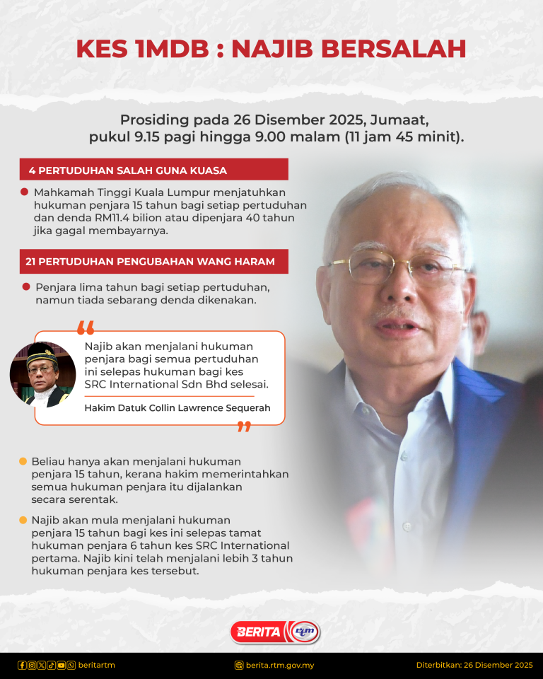KES 1MDB: DATUK SERI NAJIB DIJATUHI HUKUMAN PENJARA 15 TAHUN, DENDA RM11.4 BILION