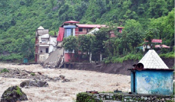 (Sebagian pusat perguruan runtuh di sepanjang sungai Maldevta setelah hujan lebat di Dehradun, India/ AFP)