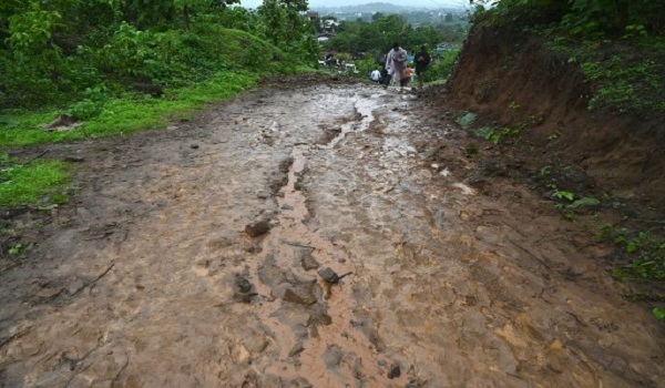 (Jalan berlumpur menuju ke lokasi tanah runtuh di perkampungan Irshalwadi