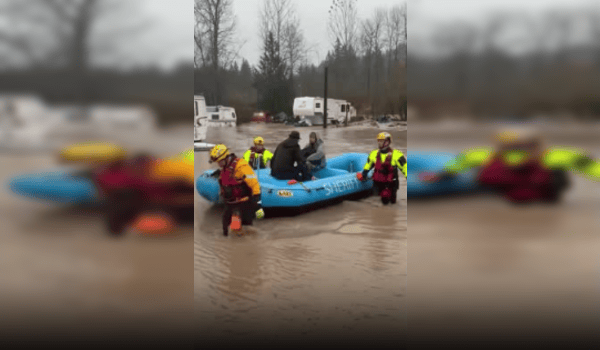WASHINGTON, 12 Disember – Pasukan kecemasan berkumpul di Bill and Dan’s RV Park, di sini, untuk menyelamatkan penduduk yang terperangkap akibat banjir susulan hujan lebat berterusan.