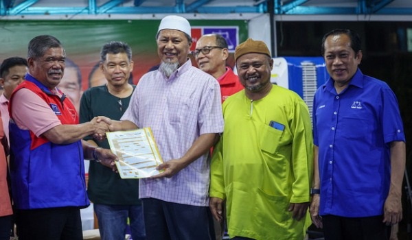 Presiden Amanah Datuk Seri Mohamad Sabu menerima borang keahlian Najib selepas Ahli Parlimen Kota Raja itu selesai berucap di Ceramah Kelompok Kempen PRK Simpang Jeram malam tadi.
