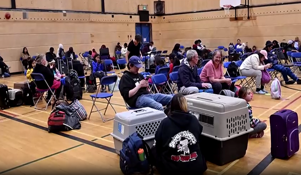 Orang ramai beratur di luar sekolah menengah tempatan menunggu dibawa ke lapangan terbang untuk menaiki penerbangan pemindahan ke Alberta.