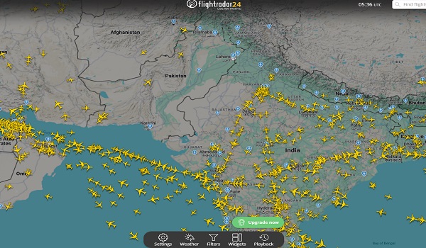 Menerusi imej penjejakan penerbangan Flightradar24.com menunjukkan barisan panjang syarikat penerbangan menggunakan laluan berbeza kemungkinan disebabkan kesesakan ruang udara.