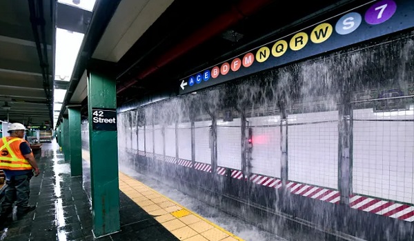 Pihak Berkuasa Pengangkutan Metropolitan (MTA) mengeluarkan video dan gambar menunjukkan air yang mengalir ke stesen Times Square-42nd Street di tengah-tengah Manhattan pada kira-kira pukul 03:00 pagi.