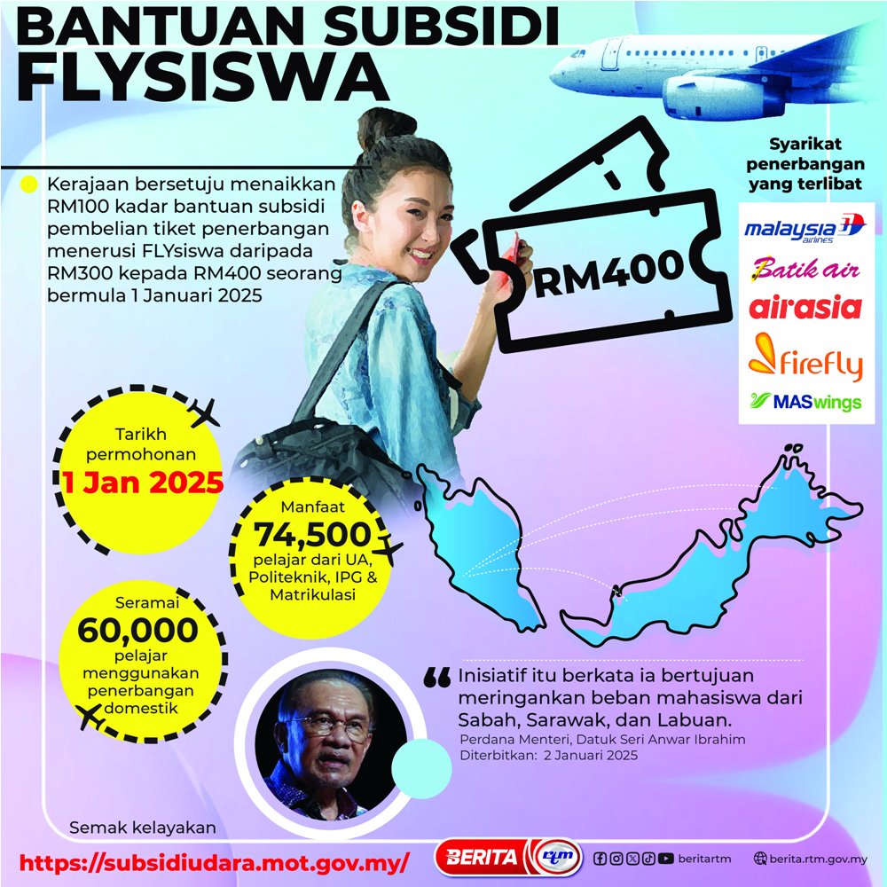 Utama Infografik BANTUAN SUBSIDI FLYSISWA BANTUAN SUBSIDI FLYSISWA3/01/2025 | 4:53 pmInfografik Kongsi berita Share on X (Twitter) Share on Facebook Share on WhatsApp Share on Telegram Berita sebelumnyaHARI BRAILLE SEDUNIA 2025Berita seterusnyaINISIATIF KADAR KOMPAUN KHAS KADAR RATA (FLATE RATE) – RM150 Makan Sihat, Hidup Sihat: Bagaimana Ajinomoto (Malaysia) Berhad Membentuk Gaya Hidup Lebih Sihat di Malaysia PALING POPULAR Ringgit dibuka rendah berbanding dolar AS, tinggi berbanding mata wang utama Ekonomi Syiling emas TMM 2026, lambang kerjasama strategik kerajaan-swasta Nasional