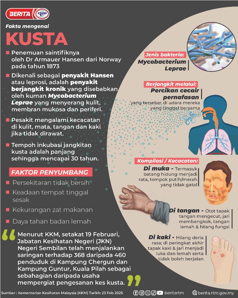 Utama Infografik FAKTA MENGENAI KUSTA FAKTA MENGENAI KUSTA23/02/2025 | 9:58 pmInfografik Kongsi berita Share on X (Twitter) Share on Facebook Share on WhatsApp Share on Telegram Berita sebelumnyaKerjasama PETROS-PETRONAS, Sarawak sedia untuk berbincangBerita seterusnyaLARANGAN PENJUALAN GULA-GULA KENYAL BERBENTUK MATA PALING POPULAR Test Buffer Dunia IMF lancar pusat serantau di Shanghai Dunia