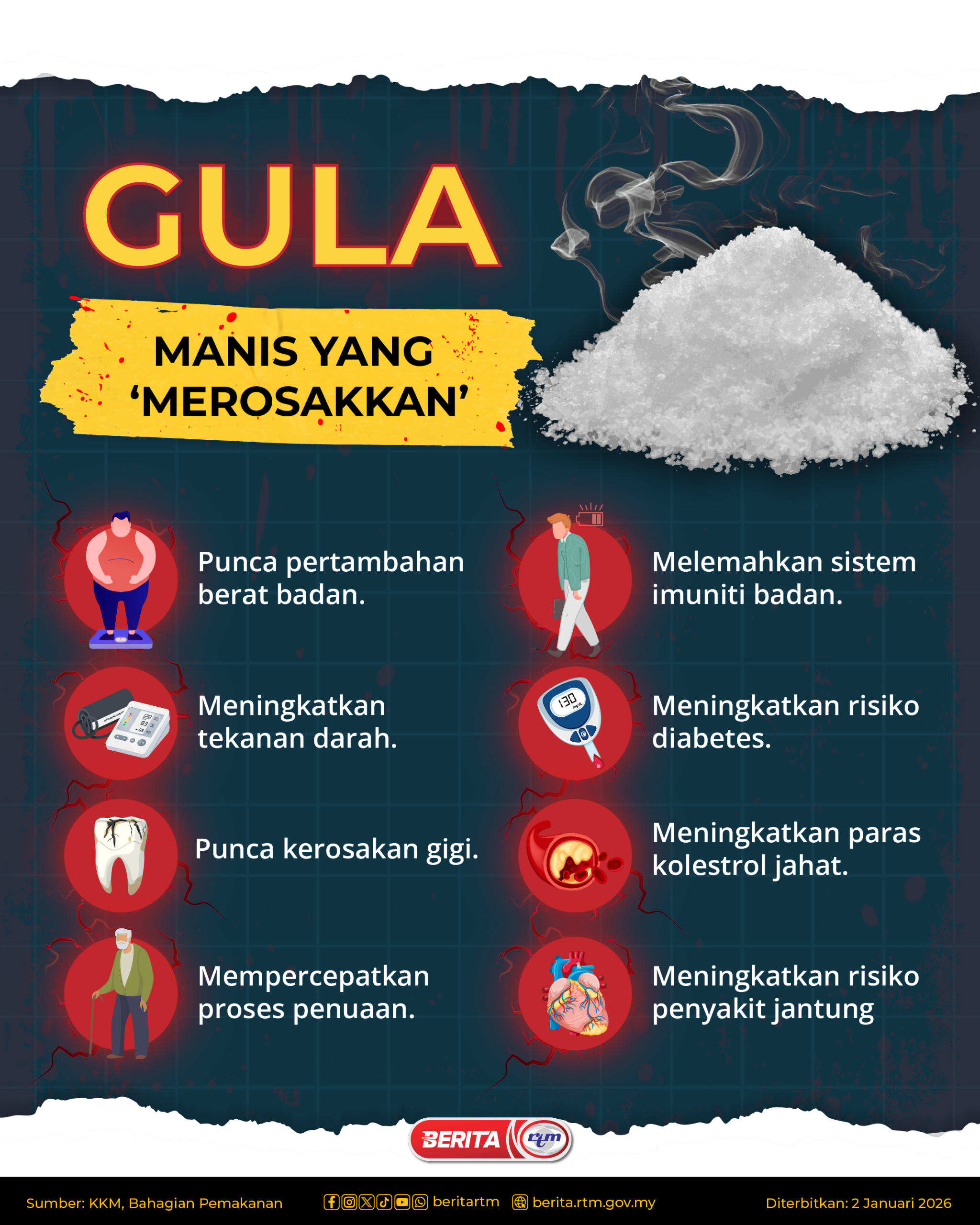 Utama Infografik GULA | MANIS YANG ‘MEROSAKKAN’ GULA | MANIS YANG ‘MEROSAKKAN’2/01/2026 | 4:57 pmInfografik Kongsi berita Share on X (Twitter) Share on Facebook Share on WhatsApp Share on Telegram Berita sebelumnya“KOS” GULA PADA MASA DEPANBerita seterusnyaOP AMBANG TAHUN BAHARU 2026 PALING POPULAR KKM nafi klinik kesihatan tidak terima pesakit ‘walk-in’ Nasional Kerajaan MADANI akan terus pelihara keharmonian, perkukuh ekonomi Nasional