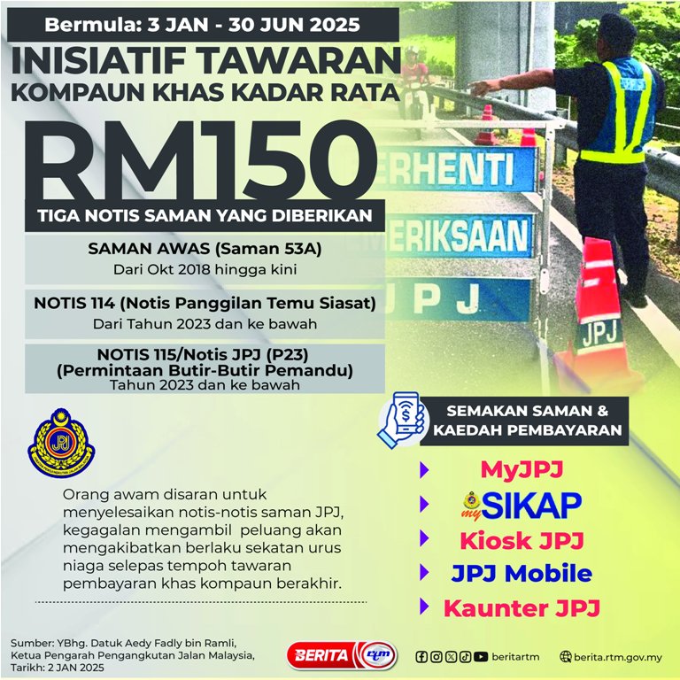 Utama Infografik INISIATIF KADAR KOMPAUN KHAS KADAR RATA (FLATE RATE) – RM150 INISIATIF KADAR KOMPAUN KHAS KADAR RATA (FLATE RATE) – RM1503/01/2025 | 8:08 amInfografik Kongsi berita Share on X (Twitter) Share on Facebook Share on WhatsApp Share on Telegram Berita sebelumnyaBANTUAN SUBSIDI FLYSISWABerita seterusnyaSENARAI KETUA JURULATIH HARIMAU MALAYA DARI TAHUN 1979-2025 PALING POPULAR KKM nafi klinik kesihatan tidak terima pesakit ‘walk-in’ Nasional Kerajaan MADANI akan terus pelihara keharmonian, perkukuh ekonomi Nasional