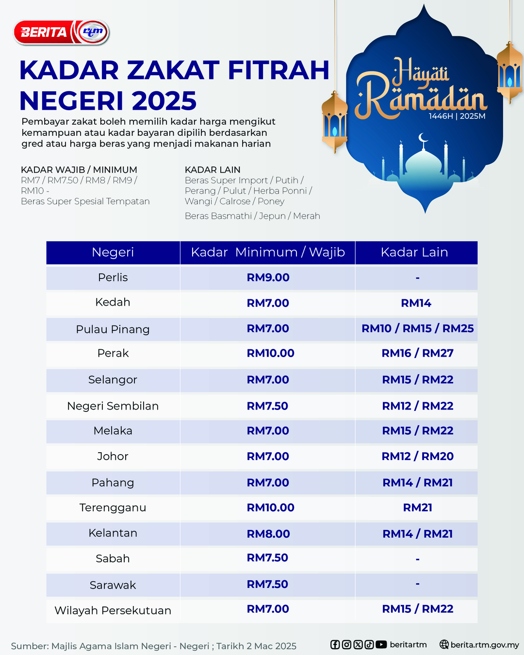 Utama Infografik KADAR ZAKAT FITRAH NEGERI TAHUN 2025 KADAR ZAKAT FITRAH NEGERI TAHUN 20252/03/2025 | 12:28 pmInfografik Kongsi berita Share on X (Twitter) Share on Facebook Share on WhatsApp Share on Telegram Berita sebelumnyaKEWAJIBAN MEMBAYAR ZAKAT FITRAHBerita seterusnyaInstallation of solar lights in Pos Belatim in JAKOA’s planning PALING POPULAR Muzium Budaya Borneo Angkat Nama Sarawak Di Peringkat Global Dalam Negeri Tiada siapa terkecuali dalam tindakan antirasuah -PM Nasional