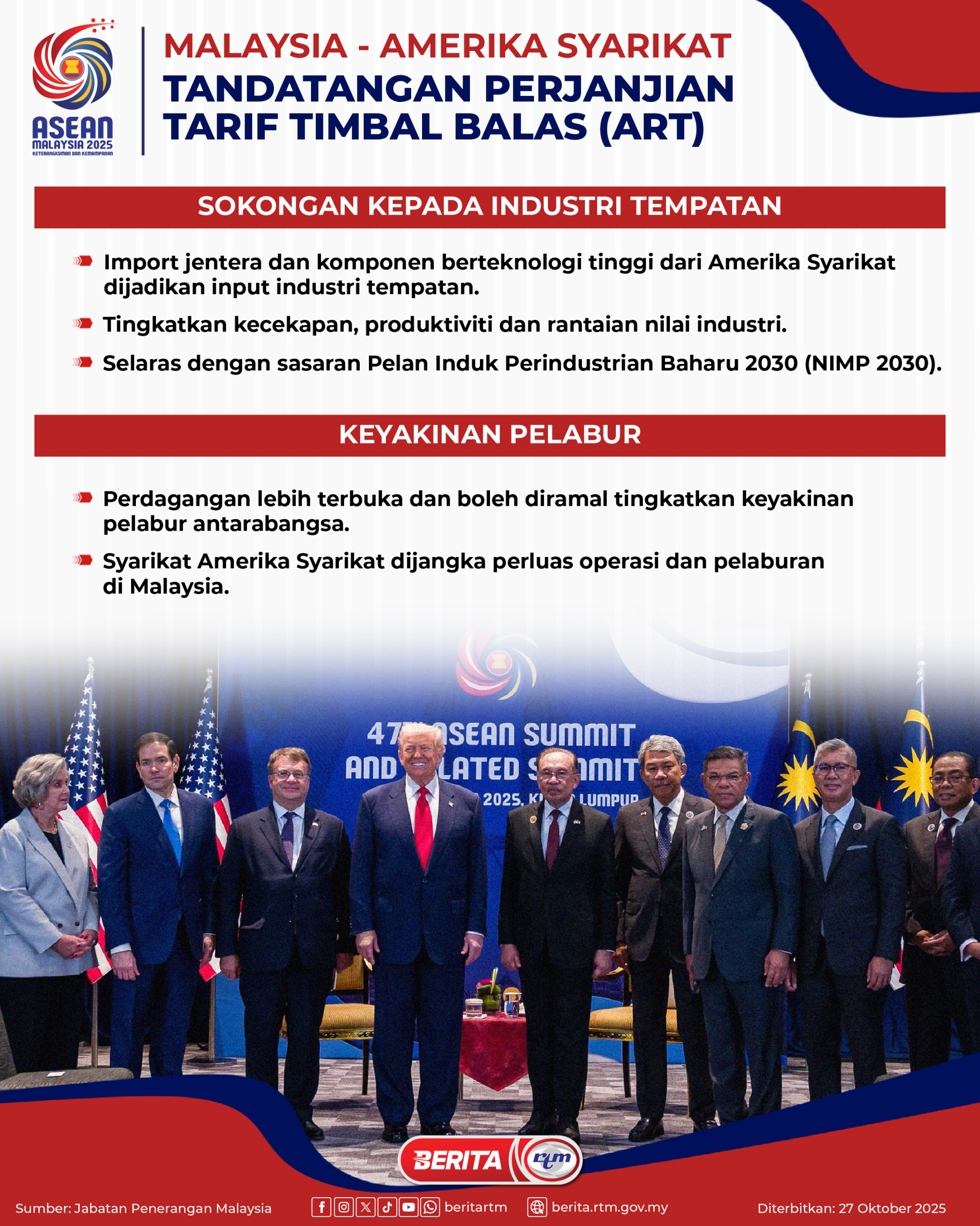Utama Infografik MALAYSIA – AMERIKA SYARIKAT | TANDATANGAN PERJANJIAN TARIF TIMBAL BALAS (ART) (3) MALAYSIA – AMERIKA SYARIKAT | TANDATANGAN PERJANJIAN TARIF TIMBAL BALAS (ART) (3)27/10/2025 | 3:52 pmInfografik Kongsi berita Share on X (Twitter) Share on Facebook Share on WhatsApp Share on Telegram Berita sebelumnyaTABUNG KEWANGAN ANTARABANGSA (IMF)Berita seterusnyaMALAYSIA – AMERIKA SYARIKAT | TANDATANGAN PERJANJIAN TARIF TIMBAL BALAS ... Makan Sihat, Hidup Sihat: Bagaimana Ajinomoto (Malaysia) Berhad Membentuk Gaya Hidup Lebih Sihat di Malaysia PALING POPULAR [TEST] Teh Tarik+Berita – Dekat, Senang & Masuk Akal! BES+ [Test: Infografik berita] Infografik