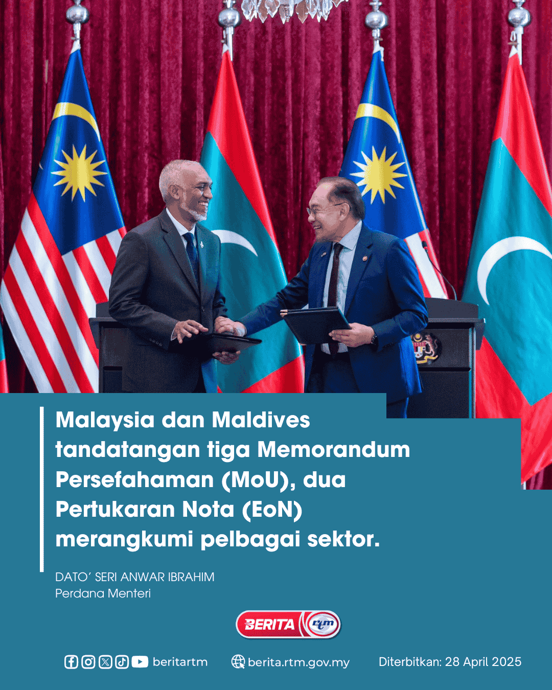 Utama Infografik MALAYSIA DAN MALDIVES TANDATANGAN TIGA MEMORANDUM PERSEFAHAMN (MOU) MALAYSIA DAN MALDIVES TANDATANGAN TIGA MEMORANDUM PERSEFAHAMN (MOU)28/04/2025 | 5:29 pmInfografik Kongsi berita Share on X (Twitter) Share on Facebook Share on WhatsApp Share on Telegram Berita sebelumnyaKelulusan poligami di Melaka dipendekkan kepada 21 hariBerita seterusnyaGraduan IPT disaran kuasai lebih tiga bahasa – MQA PALING POPULAR Muzium Budaya Borneo Angkat Nama Sarawak Di Peringkat Global Dalam Negeri Tiada siapa terkecuali dalam tindakan antirasuah -PM Nasional
