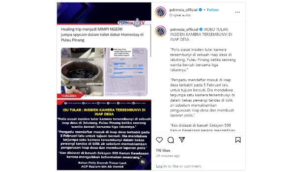 “Pengadu kemudian terus mengeluarkan kamera itu dan membuat aduan mengenai perkara berkenaan kepada pihak pengurusan inap desa sebelum ke Balai Polis Jelutong untuk membuat laporan,” katanya dalam kenyataan itu.