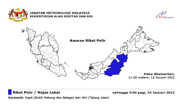 PETALING JAYA, 16 Januari – Jabatan Meteorologi mengeluarkan amaran ribut petir, hujan lebat dan angin kencang dijangka di negeri Sarawak: Kapit (Bukit Mabong dan Belaga) dan Miri (Telang Usan) hingga 3 pagi; Ahad, 16 Januari 2022.