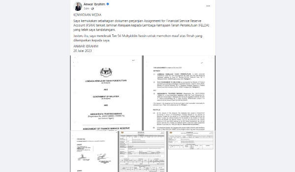 KUALA LUMPUR, 20 Julai – Perdana Menteri Datuk Seri Anwar Ibrahim hari ini mendedahkan sebahagian dokumen perjanjian Assignment for Financial Service Reserve Account (FSRA) terkait Jaminan Kerajaan kepada Lembaga Kemajuan Tanah Persekutuan (FELDA) yang telah ditandatanganinya.