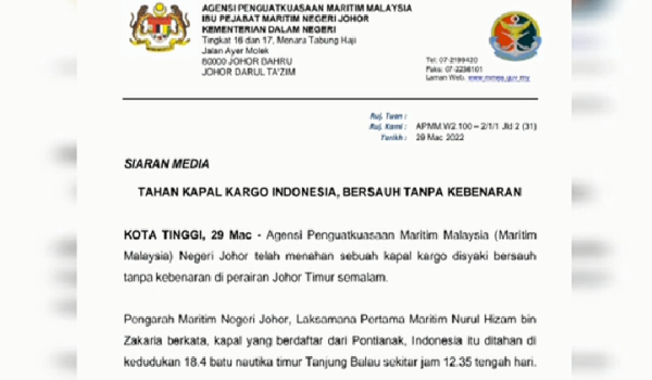 (Kenyataan rasmi dikeluarkan APMM Maritim Johor berhubung tangkapan terbabit)