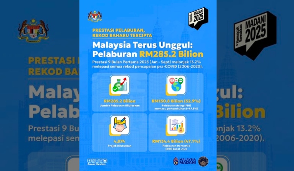 Antara paparan infografik ialah prestasi pelaburan Malaysia diluluskan mencecah RM285.2 bilion bagi tempoh Januari hingga September 2025, meningkat 13.2 peratus sekali gus mengatasi rekod tertinggi sebelum pra-COVID antara tahun 2006 hingga 2020.