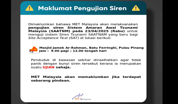 GEORGE TOWN, 22 April- Jabatan Meteorologi Malaysia (MetMalaysia) akan melaksanakan pengujian siren Sistem Amaran Awal Tsunami Malaysia (SAATNM) di Masjid Jamek Ar-Rahman, Batu Ferringhi esok.