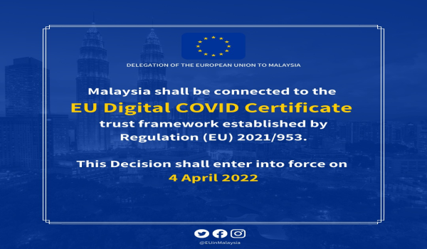 “Berita baik, EU telah menerima permintaan Malaysia untuk mewujudkan penyelarasan antara Sijil COVID Digital EU dengan MySejahtera di Malaysia.