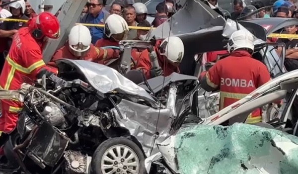 Rempuhan itu menyebabkan kedua-dua kenderaan remuk teruk, selain turut merosakkan sebatang tiang lampu isyarat.