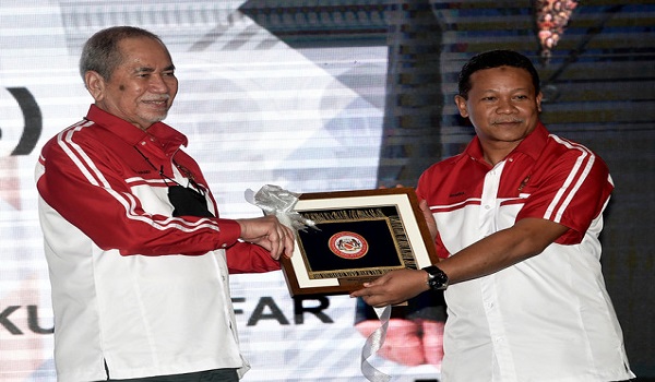 (Datuk Seri Dr Wan Junaidi Tuanku Jaafar menerima cenderahati daripada Ketua Pengarah Bahagian Perlindungan, Jabatan Perdana Menteri Khairul Anwar Zakaria (kanan) selepas merasmikan Seminar Program Perlindungan Saksi 2022/BERNAMA)
