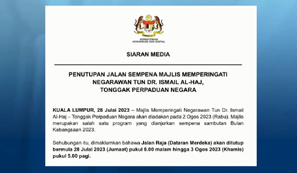 Orang ramai dinasihat untuk rancang perjalanan sepanjang tempoh 28 Julai, bermula 8.00 malam sehingga pukul 5.00 pagi pada 3 Ogos (Rabu).