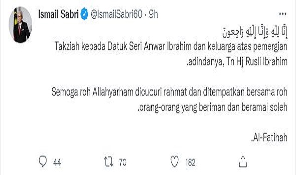 “Takziah kepada Datuk Seri Anwar Ibrahim dan keluarga atas pemergian adindanya, Tn Hj (Tuan Haji) Rusli Ibrahim.