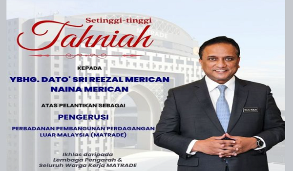 KUALA LUMPUR, 2 Mei – Bekas menteri, Datuk Seri Reezal Merican Naina Merican dilantik sebagai pengerusi kesembilan Perbadanan Pembangunan Perdagangan Luar Malaysia (MATRADE) berkuat kuasa serta-merta.