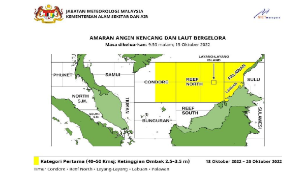 Pada 15 Oktober 2022 pula telah dikeluarkan amaran angin kencang dan laut bergelora kategori pertama.