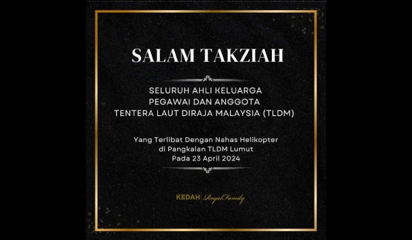 ALOR SETAR, 23 April- Sultan Kedah Al Aminul Karim Sultan Sallehuddin Sultan Badlishah serta Keluarga Diraja Baginda menzahirkan rasa sedih dan simpati atas tragedi nahas helikopter yang mengorbankan 10 pegawai dan anggota Tentera Laut Diraja Malaysia (TLDM) di Pangkalan TLDM Lumut, Perak, hari ini.