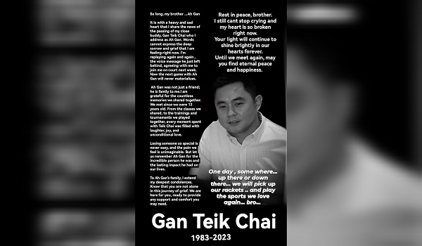 KUALA LUMPUR, 6 Ogos- Persatuan Badminton Malaysia (BAM) menzahirkan dukacita dengan pemergian bekas pemain beregu negara, Gan Teik Chai yang meninggal dunia pada usia 40 tahun, semalam.